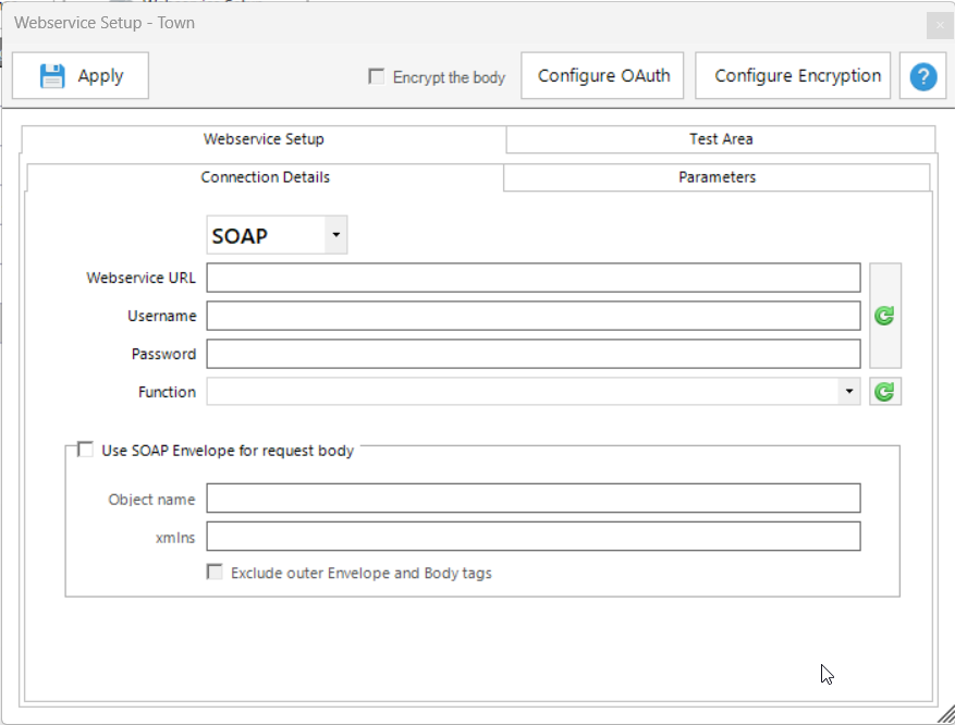 •Your configuration can be tested with sample data using the Test Area tab, in which the result returned by your webservice can be viewed and verified.