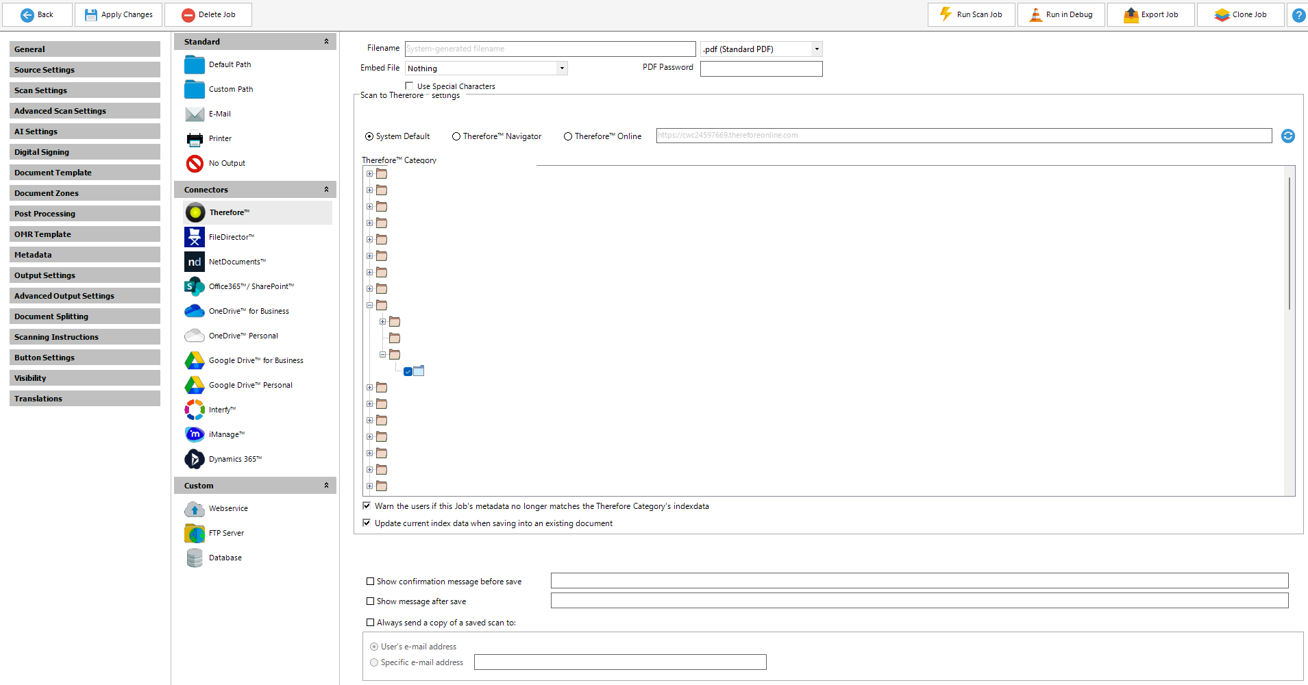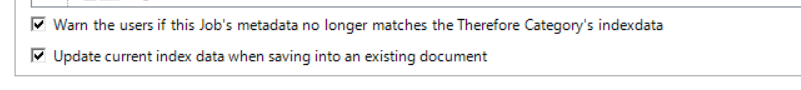 If for some reason the Therefore Category that Scan2x is saving documents into is changed slightly, there is an option where, if ticked, Scan2x will warn the user during scanning that the Job's metadata of the job no longer matches the Therefore Category's index data.