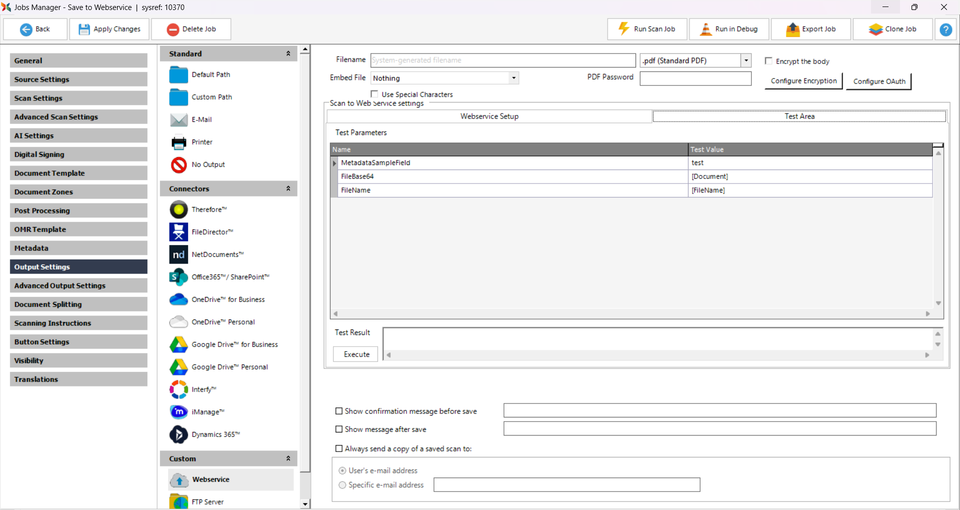 This functionality ensures that an administrator can test the communication between Scan2x and the webservice on the fly.