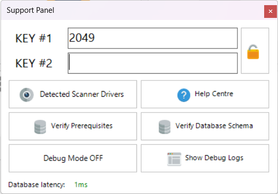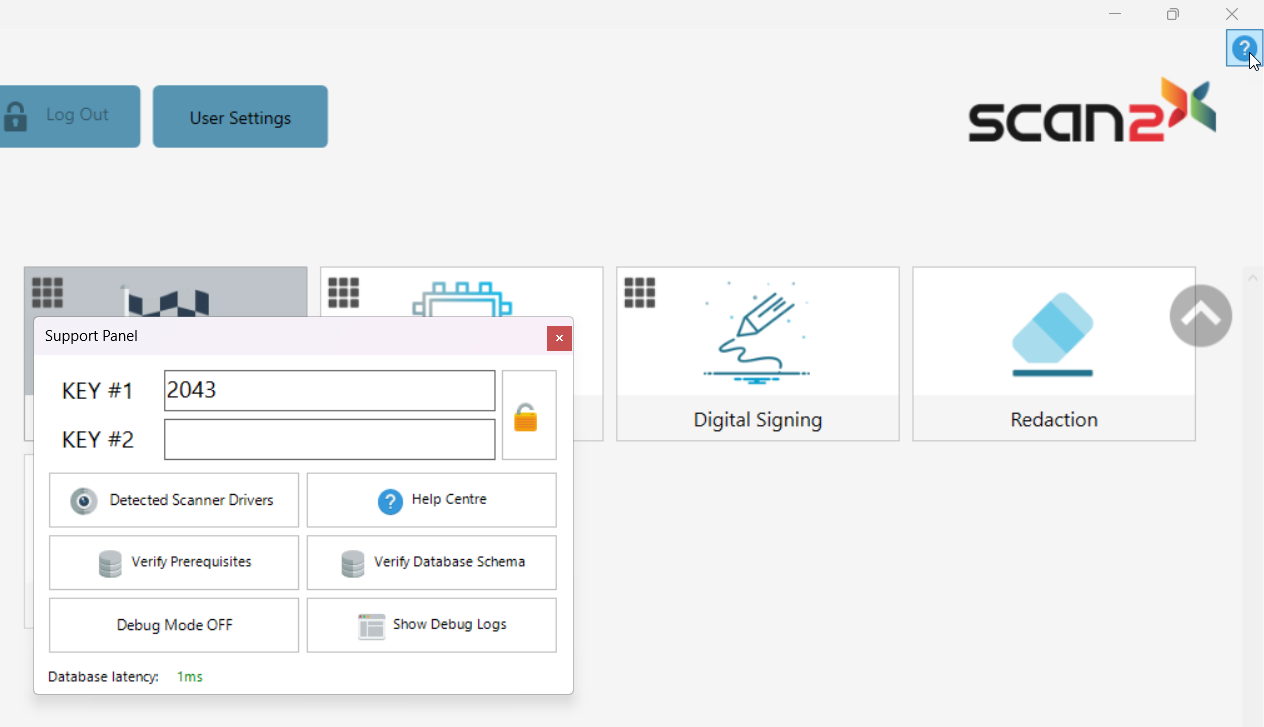 We understand that it is not always possible for us to connect remotely from our offices to help with problem-solving due to security policies, and so Scan2x has a comprehensive troubleshooting mode for administrators to help in identifying issues that may occur. To access this mode, log in as an administrator and hit the Ctrl-Shift-TAB keys simultaneously or press the blue ? button at the top-right corner of the Home Page. The below screen will appear.