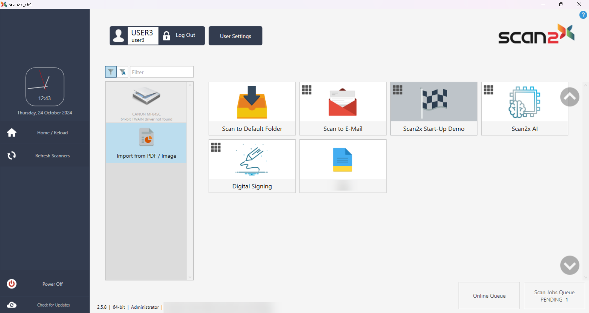 The main window will display the Username, in the top left corner, together with a Logout button to terminate your session. Below this is a grey panel which displays icons of different sorting of scan jobs and groups which include default sorting and alphabetical sorting. One can also search for the name of the scan group or job from the Filter search bar. There are also icons of the scanners connected to Scan2x and one which allows you to import a document from a PDF.