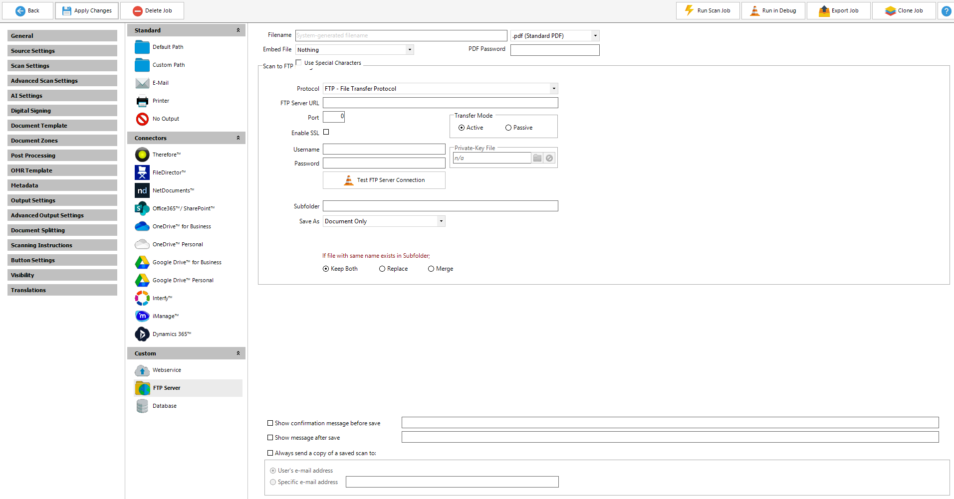 Press the Test FTP Server Connection button to test the connection on the fly. Use the Subfolder text box to specify a particular subfolder for this job. Note that this subfolder can be dynamically determined at scan time by using the metadata variables as described on the Scan to Path Tab in the Administrator's Guide.