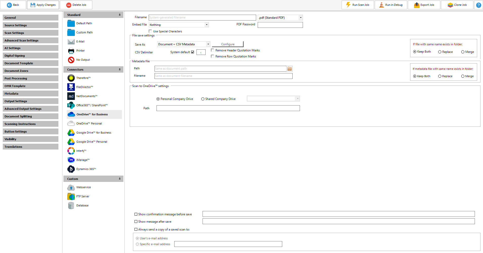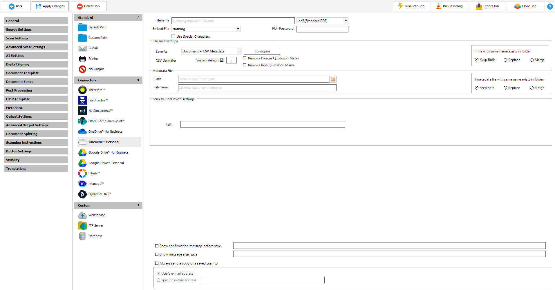 Scan2x is able to output documents to Microsoft OneDrive™ Personal and OneDrive™ for Business, by selecting this destination in Output Settings.