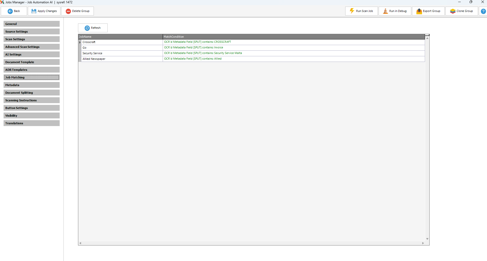 As seen in the screenshot below, each child job has green text under the column MatchCondition. This means that the splitting conditions of each child job is unique and so Scan2x will be able to identify the documents to the correct corresponding child job.