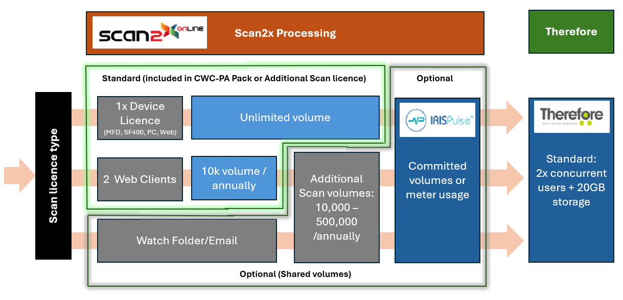 The diagram below shows the different flavours of Document Capture licences available for Scan2x within CWC. It is possible to increase the number of Device licences and Web Client licences without adding the cost of additional Therefore DMS users, if required.