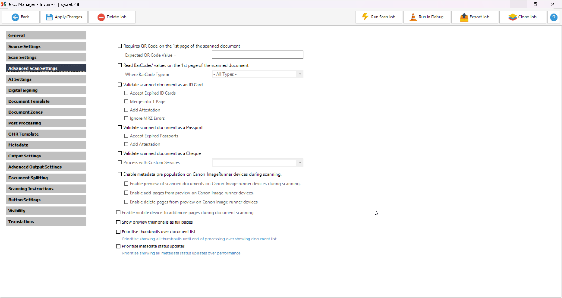 The Require QR Code on the 1st page of the scanned document checkbox enables a function to scan the first page of any document scanned using this job, to ensure that a QR Code exists.