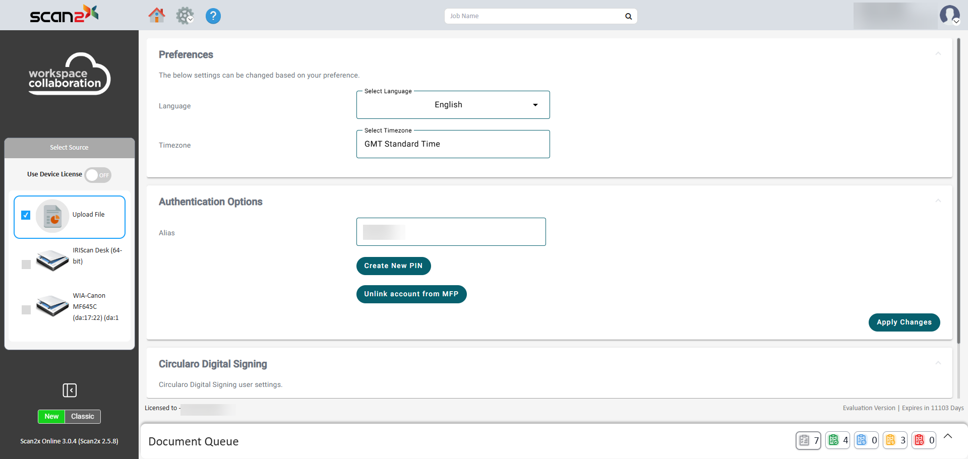 Under the Circularo Digital Signing section, if the user has an account with Circularo, they can insert their credentials. This would be used in instances where a scan job would require the user's digital signature.