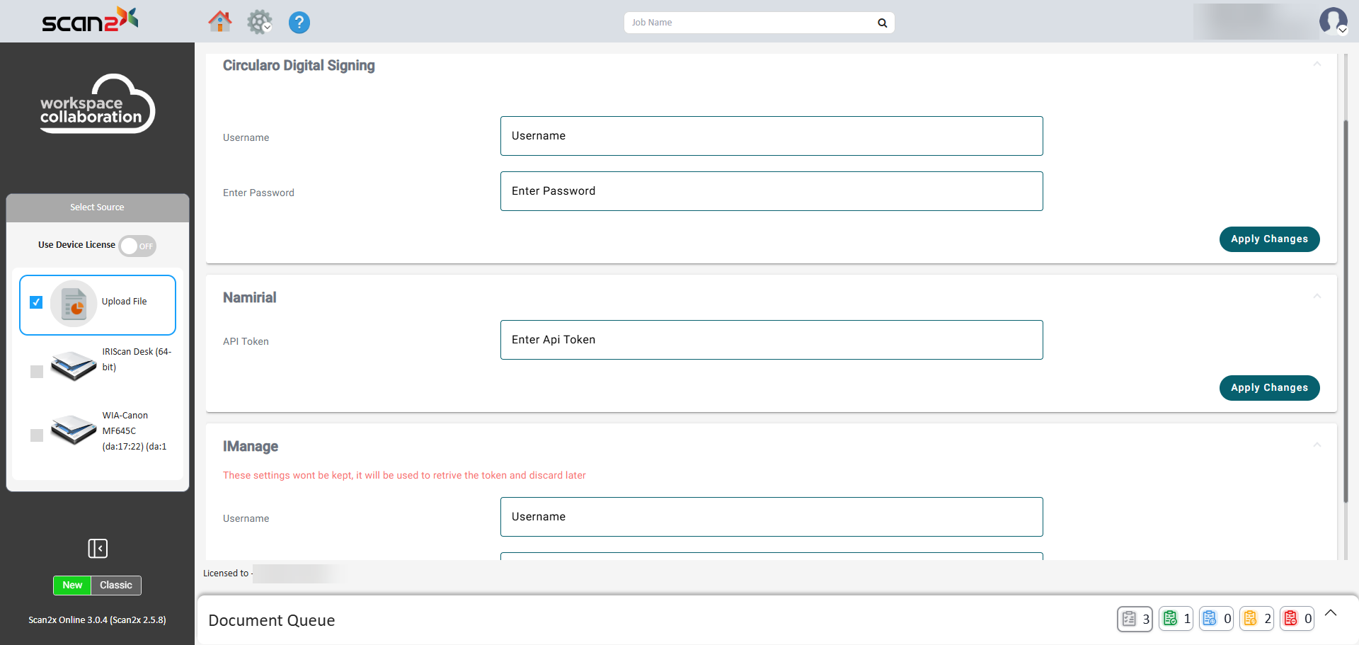 Under the iManage™ section, if the user has an account with iManage™, they can insert their credentials. This would be used in instances where a scan job would be saving to iManage™. Please note: The credentials input will not be retained. They will be used to retrieve a token and then discarded since they will not be required.