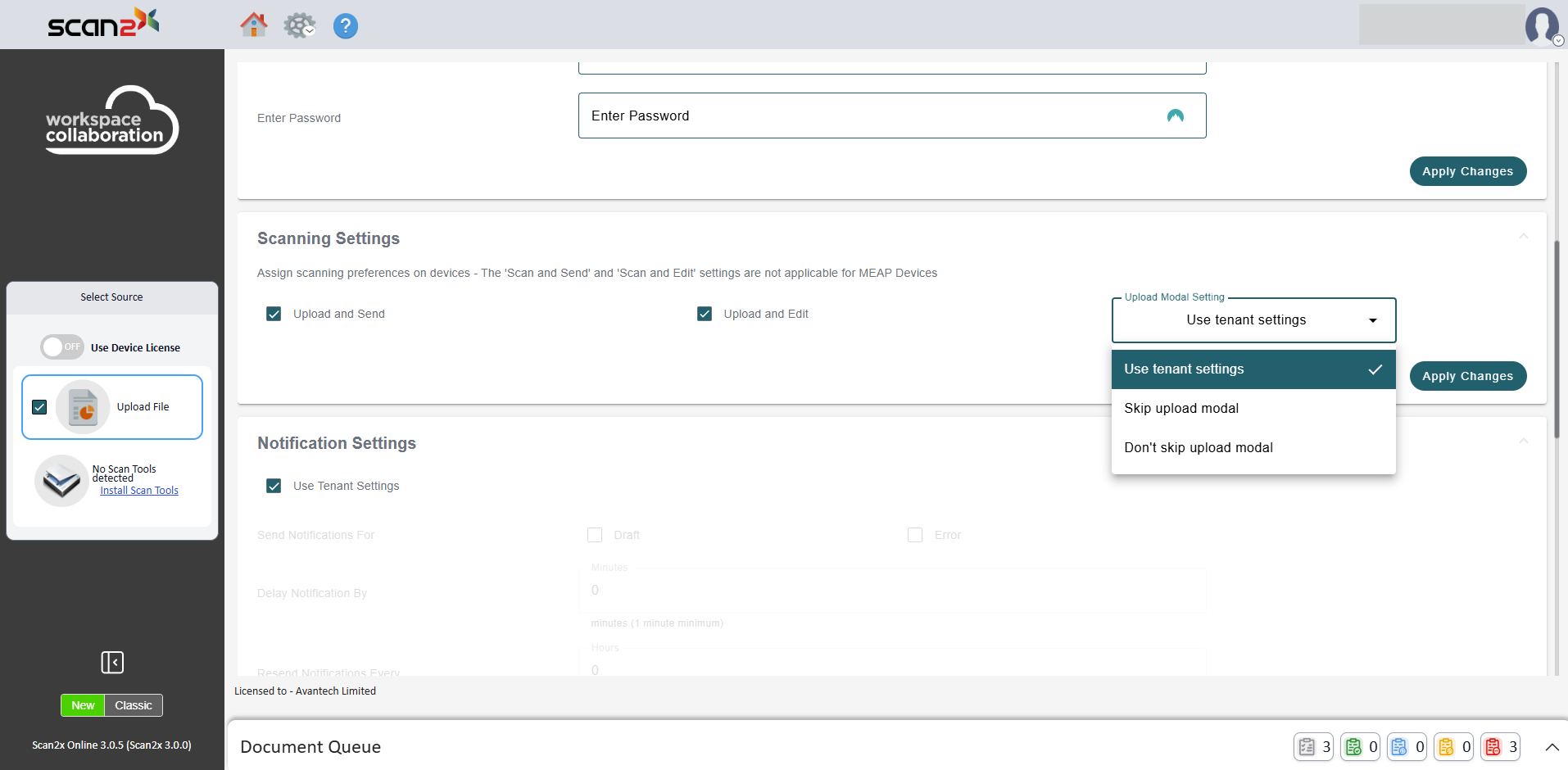 The options under Scanning Settings allows the administrator to choose the preferred mode of scanning for the tenant. Whether this is 'Upload and Send'; which allows users to scan a document with a MFD, like a scanner, and the processed scan will show in the user's scan queue on their device (computer), 'Upload and Edit'; which allows users to upload a document from their device (computer) and view a scan preview and document metadata on the screen of the device, or both, or 'Skip Upload Modal,' which allows users to scan the document and have it processed directly without opening the scanning tab; or a combination of these options.