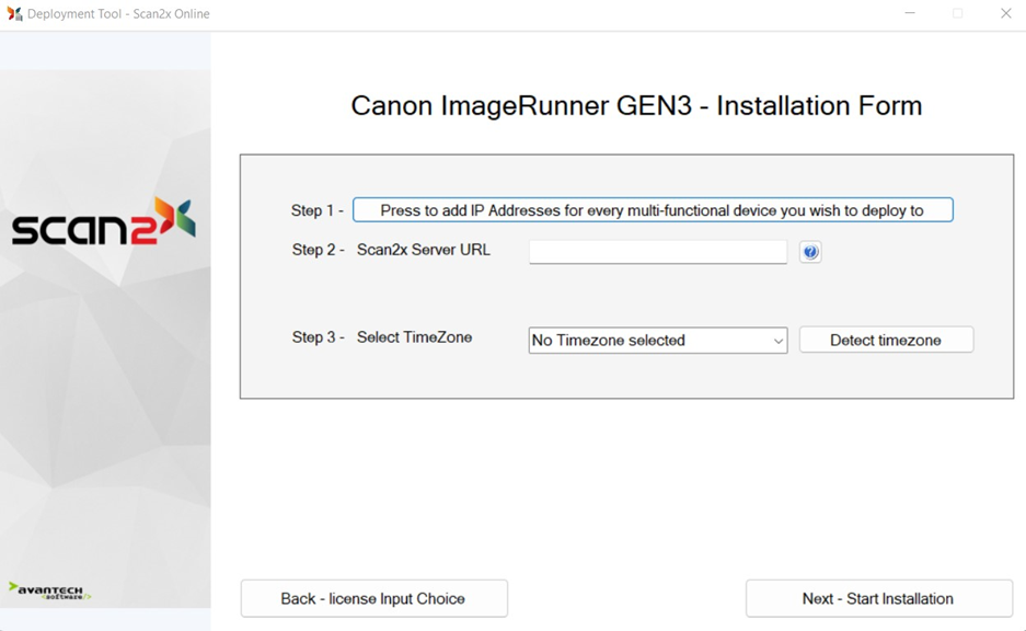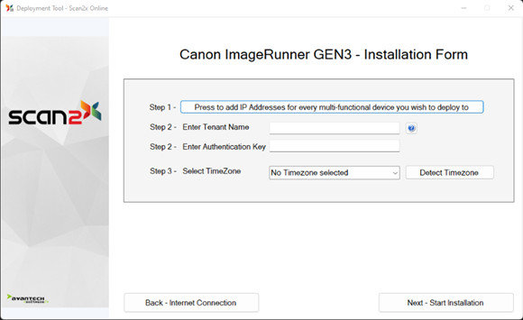 Scan2x can work inside Canon’s imageRUNNER Adv Gen3 and DX series of multifunctional copier-printer-scanner devices. To do this, an application needs to be installed on the device, and to do this we use the Scan2x Deployment Tool.
