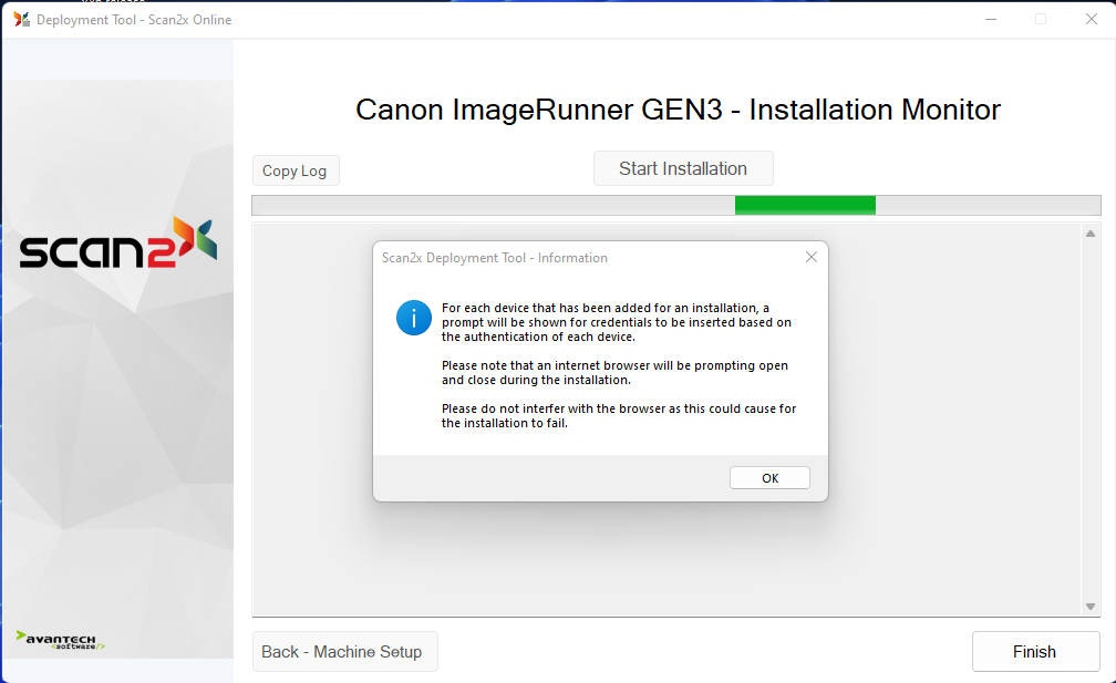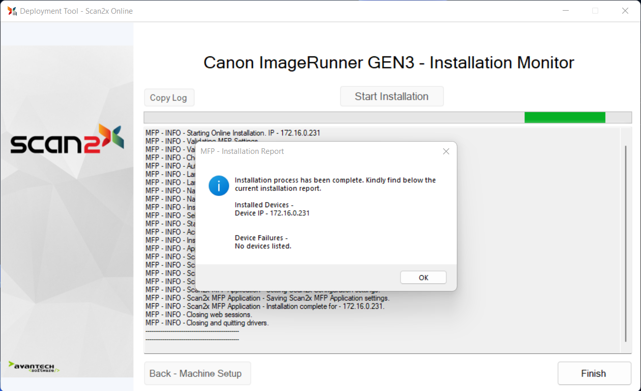 Click on “Start Installation” to start the installation and setup process for the MFP. The deployment tool will register progress and activity in the activity box and will also automate your Chrome browser in order to configure each imageRUNNER listed in the IP Address list entered earlier.