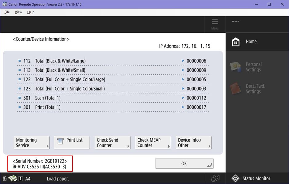 The serial number of each MFP can be found by clicking on right hand side of the touchscreen next to sleep button. The button is on side and is labelled as “123”. A prompt message box is shown on the MFP and the serial number is located at the bottom right of the message box.