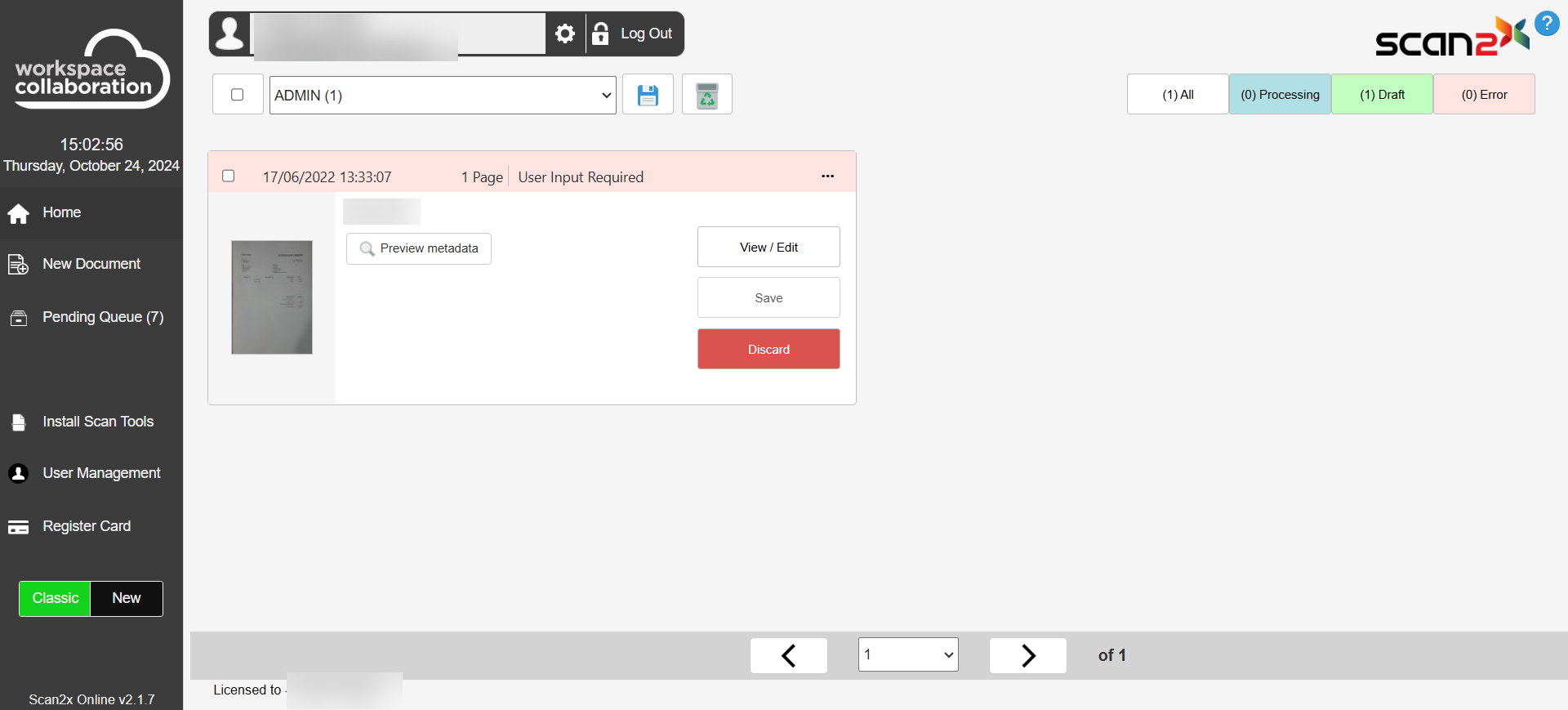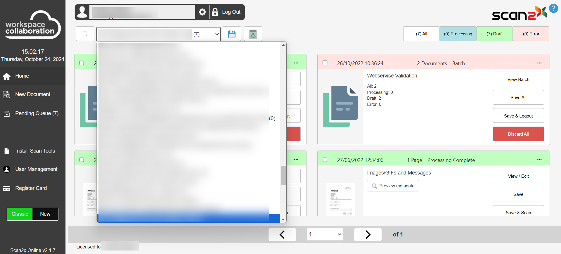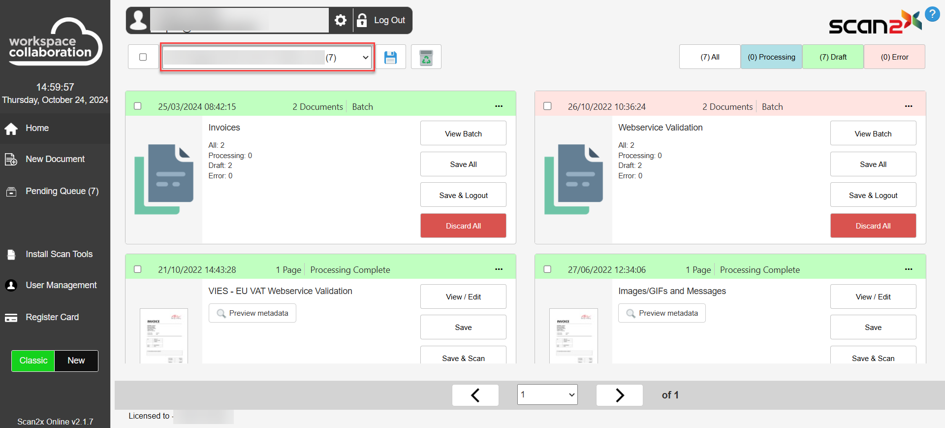 When a batch of documents is scanned, the user will see the following buttons near the box where the User's Name is shown, as seen in the screenshot below.