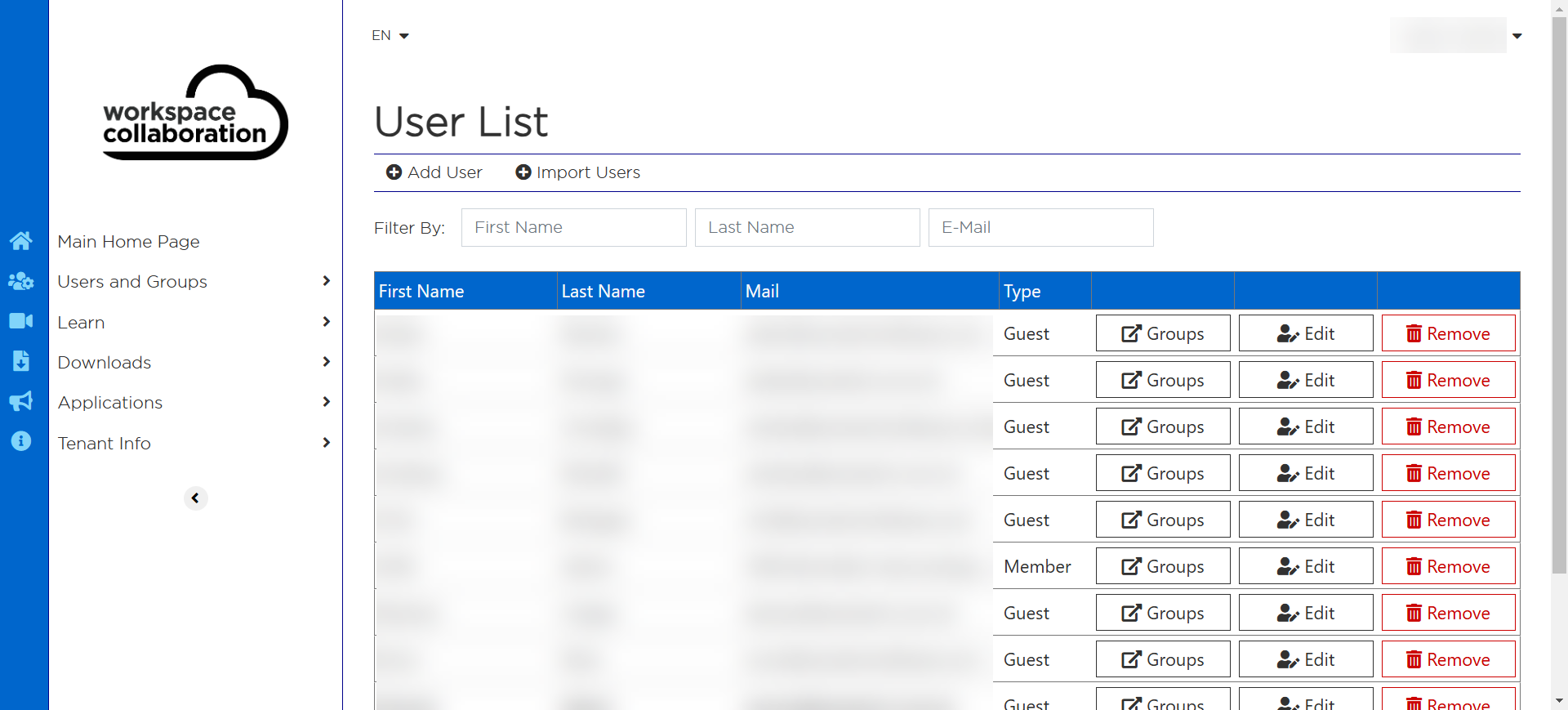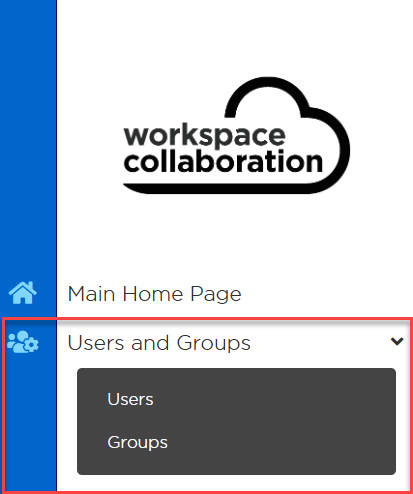 From the CWC Home page, administrators can view the users and groups from the side panel on the left-hand side of the screen.