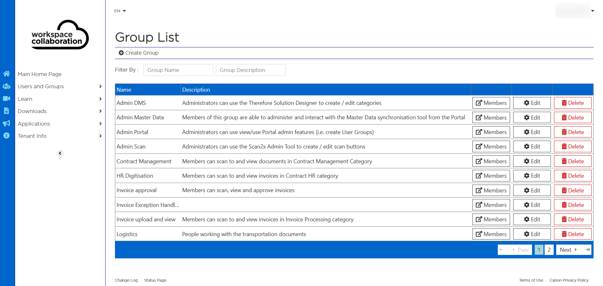 Administrators can view the users of a particular group, search for a group by using the filter option, create a group, edit (changing the name or description) and delete.