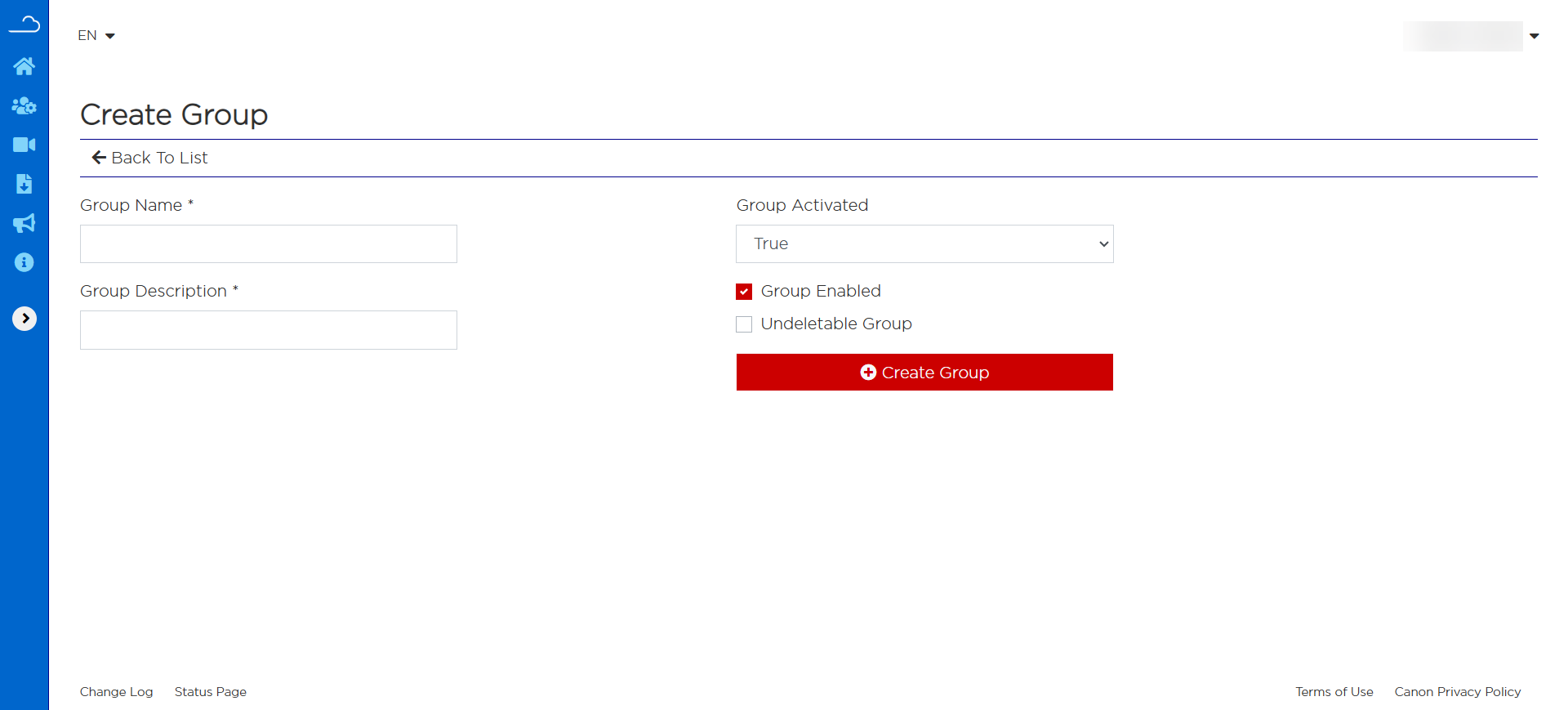 In order to create a group, the administrator must click the Create Group button, and the following page will appear. The administrator then needs to add a group name, group description, and activate the group ('True'). They also have the options of make the group undeletable. Then click Create Group and the new group will be added.