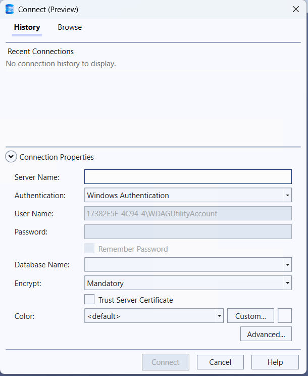 ØNote: Please make sure the below options are set accordingly in SSMS in order to authenticate in Scan2x via SQL