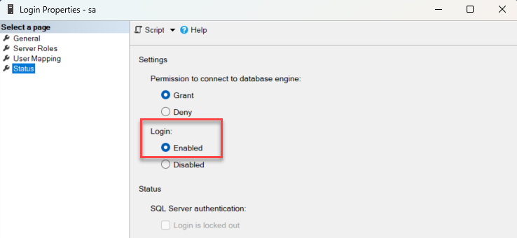 Once applied, disconnect from the database and try and login with the default user 'sa' with the SQL authentication.