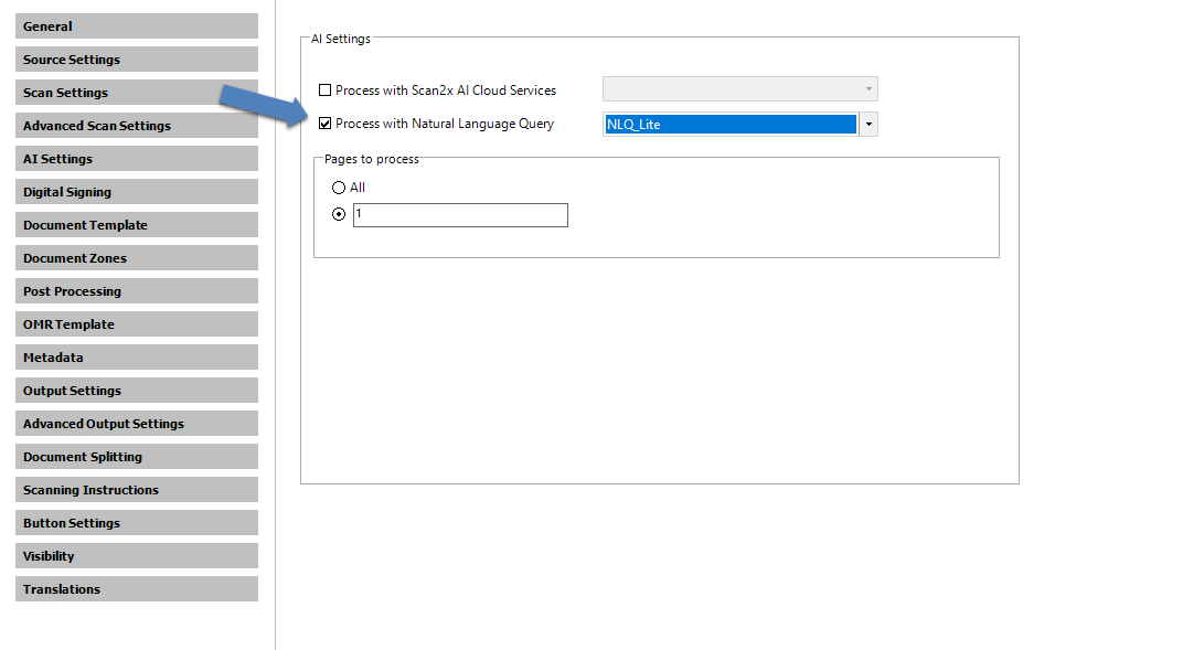 To enable Natural Language Query (NLQ) in Scan2x, navigate to the AI Settings tab and select the "Process with Natural Language Query" option. Once selected, click Apply Changes to save your settings. This will activate NLQ for processing scanned documents for the specified scan job.