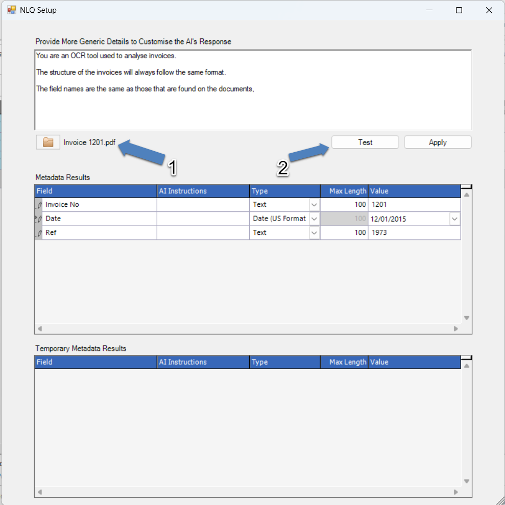 Once the metadata field is created, proceed to the NLQ Setup by clicking the NLQ Setup button. Here, the administrator will need to enter a prompt that defines what kind of data the AI should extract from the scanned documents. The prompt should be clear and specific to ensure accurate results. For example, if the administrator needs to extract the Invoice Total and Supplier Name from scanned invoices, you could enter a prompt such as, "Extract the invoice total and supplier name from scanned invoices." Additionally, you can enter specific AI instructions to fine-tune the extraction process. If you want the AI to focus only on machine-printed text and ignore handwritten content, you could specify, "Ignore handwritten text and extract only machine-printed values."