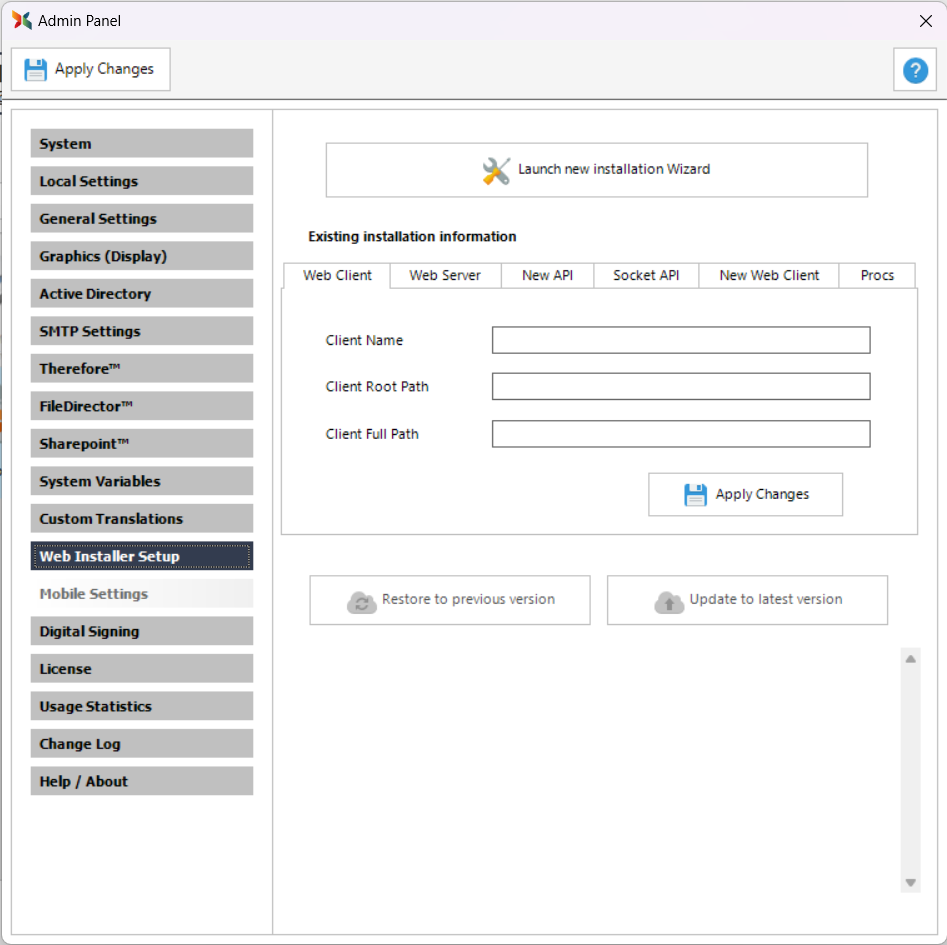 The 'Restore to previous version' button and the 'Update to latest version' button allow the administrator to restore an installation which sets the backup previously set, or update to the latest Scan2x web updated files.