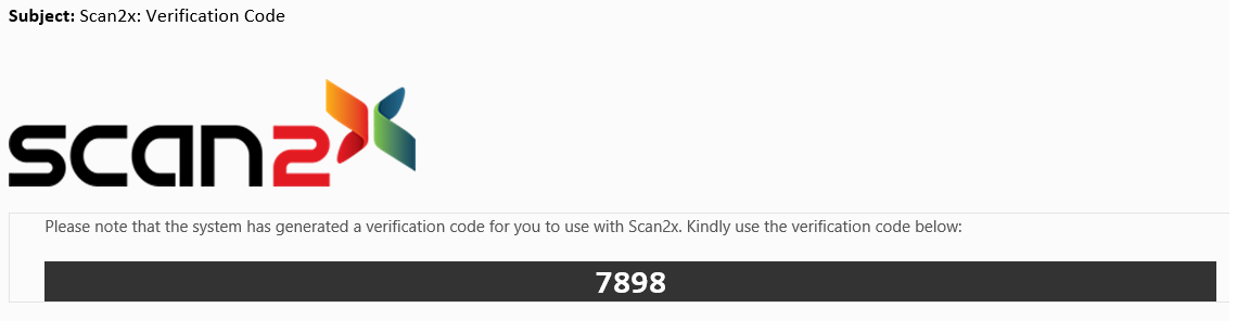 Please insert the code received by email in the Scan2x Verification Code panel (this will appear once a new email has been input).