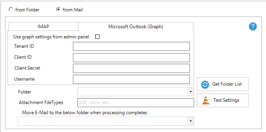 The rest of the functionality is identical to the pre-existing IMAP functionality. If the above information is already set in the Mail Settings tab -> Microsoft Graph in Admin Panel, then the administrator can tick the Use graph settings from admin panel checkbox. Folder - Click 'Get Folder List' button, and you should be able to see the folders there are in the mailbox by clicking the dropdown button. Select the folder which Scan2x will monitor. Attachment FileTypes - This can either be left blank if different file types will be processed, or you can specify which file types the mailbox will process. For example: .pdf, .docx Move E-Mail to the below folder when processing completes - From the dropdown button, select the folder where Scan2x will move the email once the attachment has been processed.