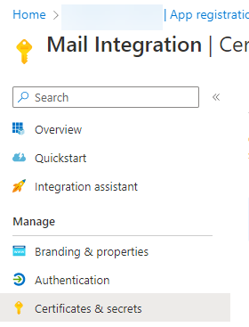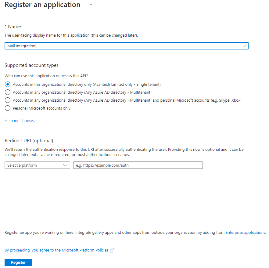 Create a new App Registration and call it “Mail Integration”.