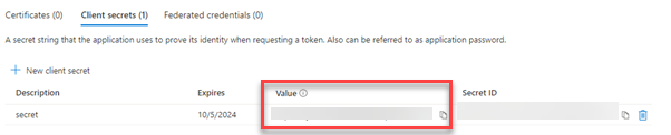 Under “Client Secrets” click on “New client secret”, specify a description and choose 24 months expiry, then finalise by clicking Add.
