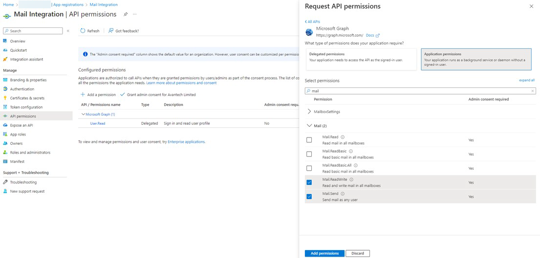 Click “Add a permission”, choose Microsoft Graph, choose Application Permissions, search for “Mail”, tick Mail.ReadWrite and Mail.Send and finalise by clicking the Add Permissions button.