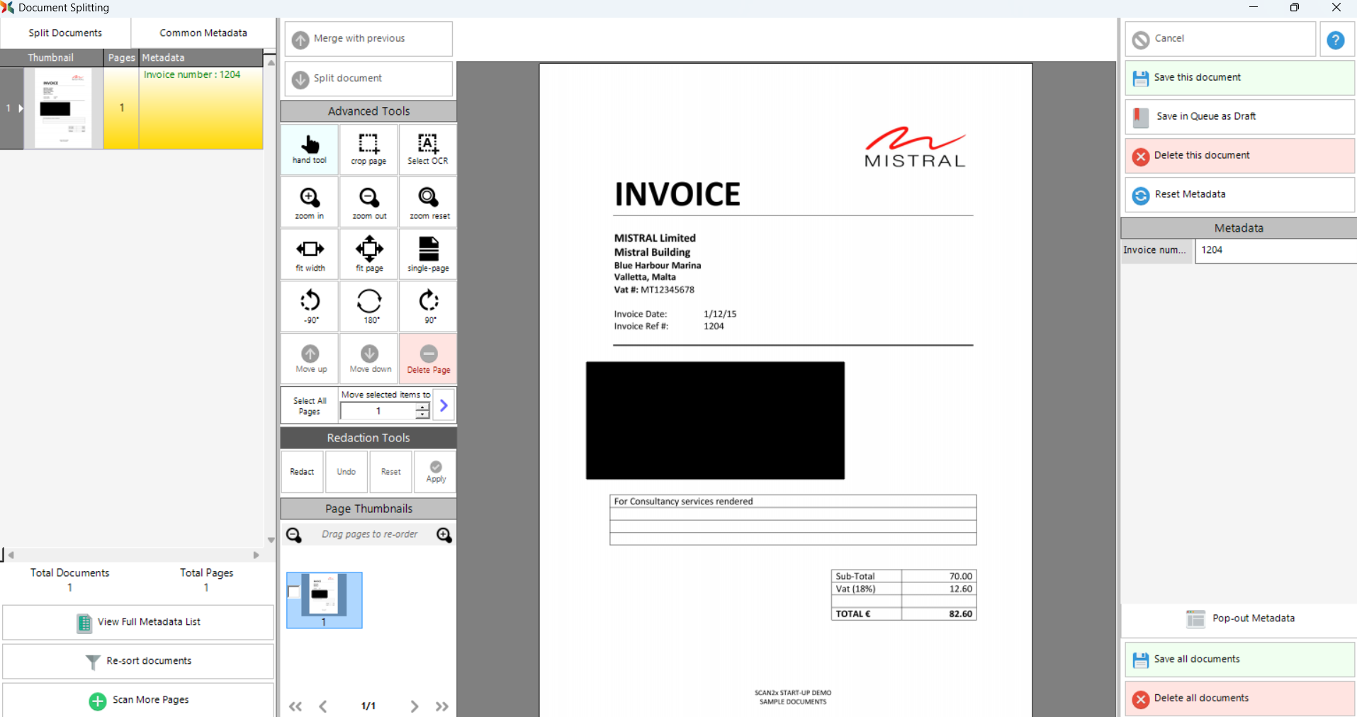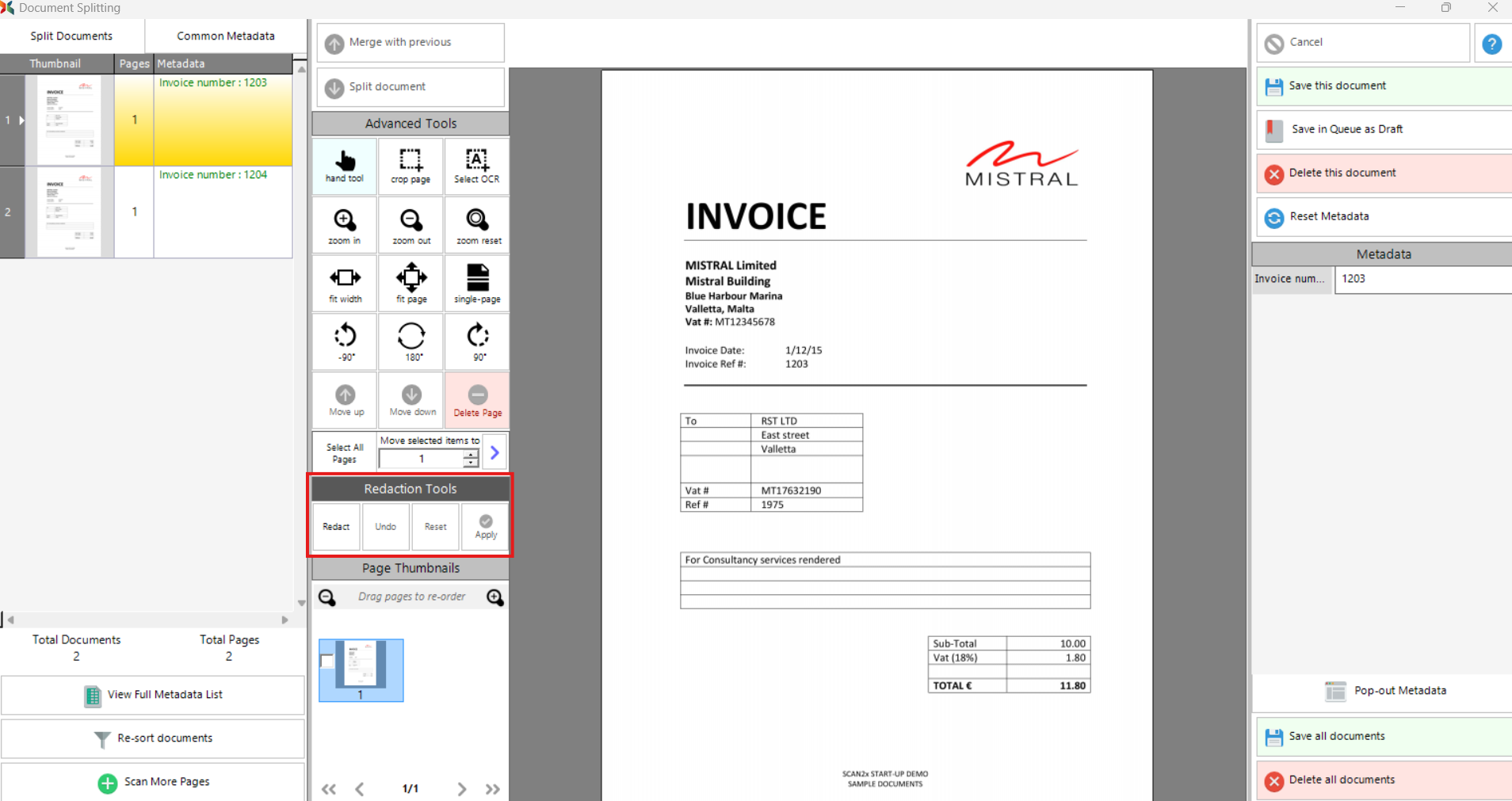 Scan2x provides two methods for redacting sensitive information from scanned documents. Redaction ensures that specified areas of a document are obscured and cannot be viewed in the scan preview or in the final document output. Below are the available redaction workflows: