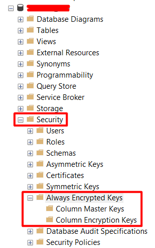•Go to the “Security” > “Always Encrypted Keys” tab inside the database, using the SQL Management Studio.
