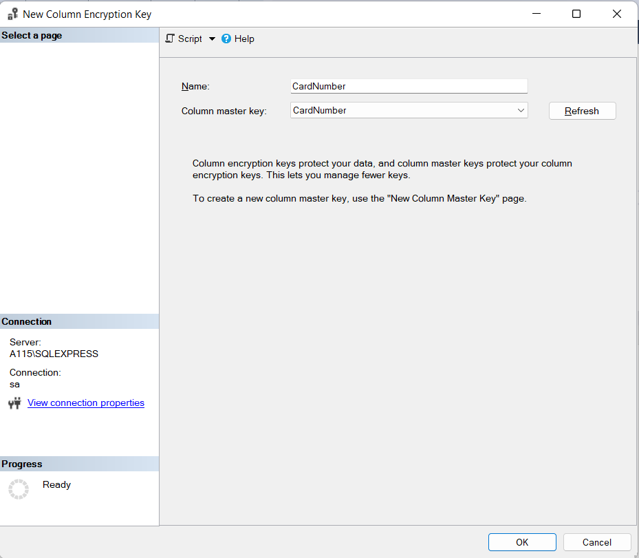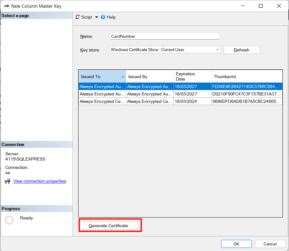 •Create a new “Column Encryption Keys” using the Master Key previously created.