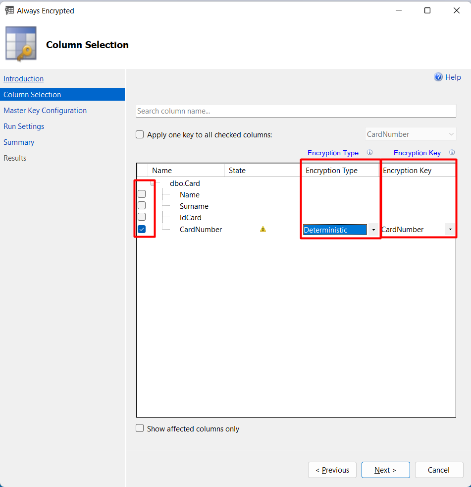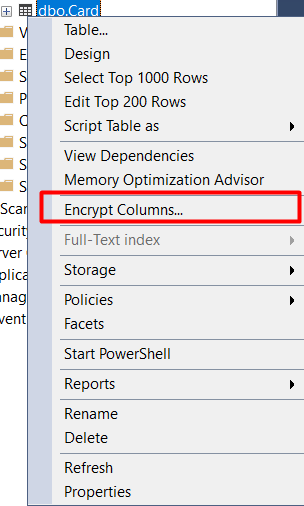 •Select the table in which a column will be encrypted, right-click on the selected table, and choose the option “Encrypt Columns”