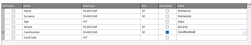 •Configure the last column with the desired properties and select the checkbox under the 'Encrypted' column to encrypt the database table column.