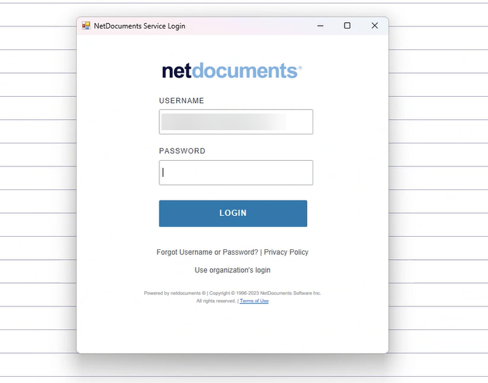 When the NetDocuments output is clicked, the administrator will see the following pop up asking the user to log in.