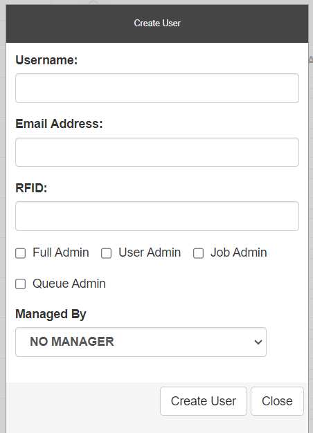 Once the Create User button is clicked, the administrator can fill in: