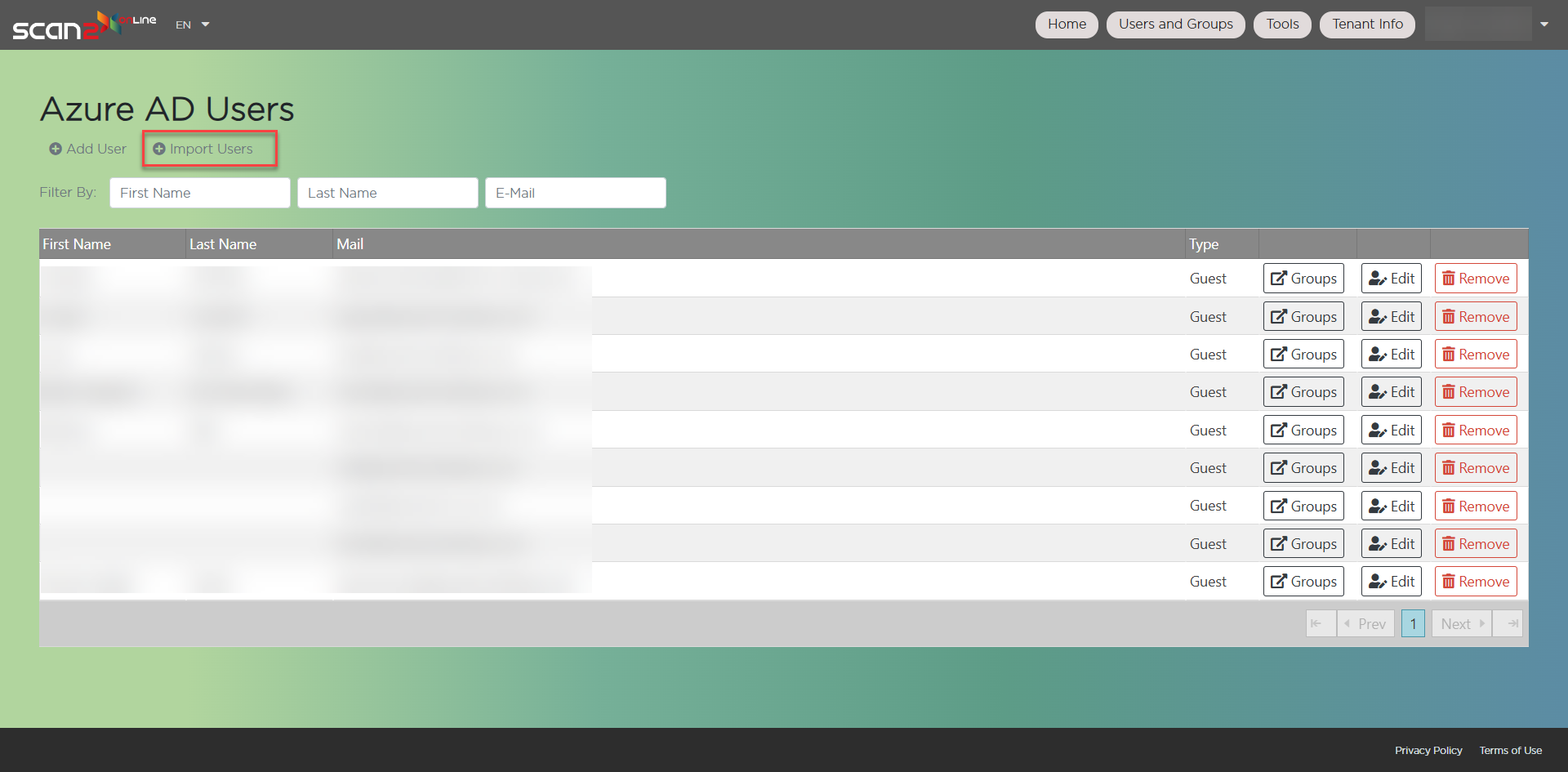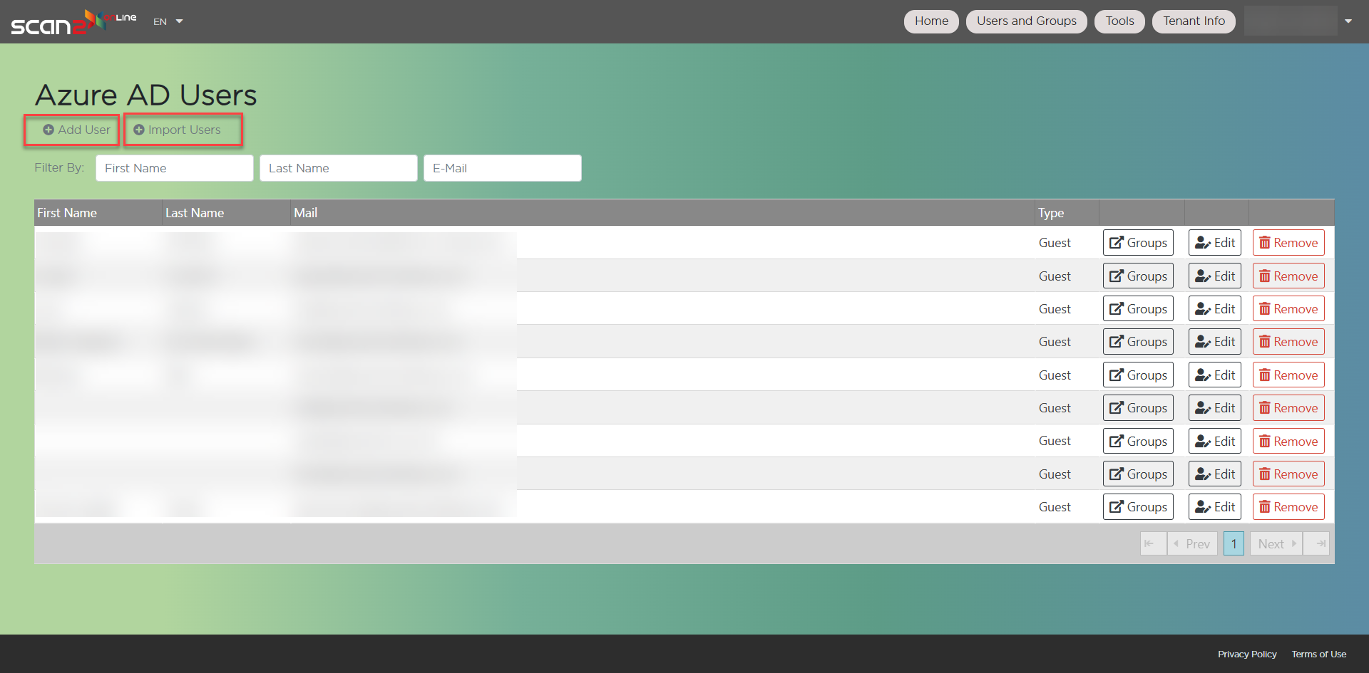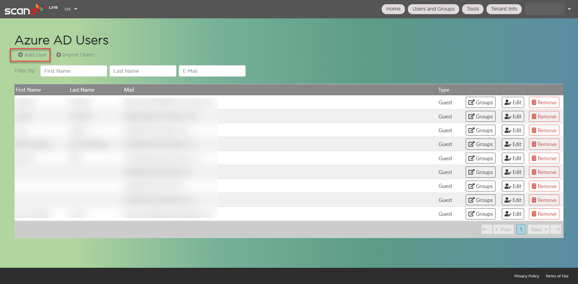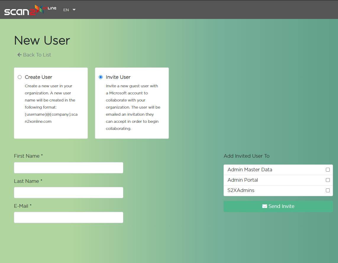To create users on your Scan2x Online tenant, click the Users button.