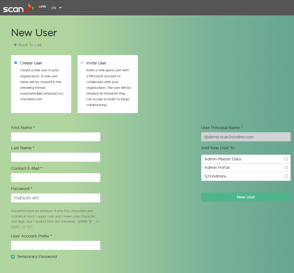 Once the information is filled in and the New User button is clicked, the new user will receive an email with their credentials to Scan2x Online.