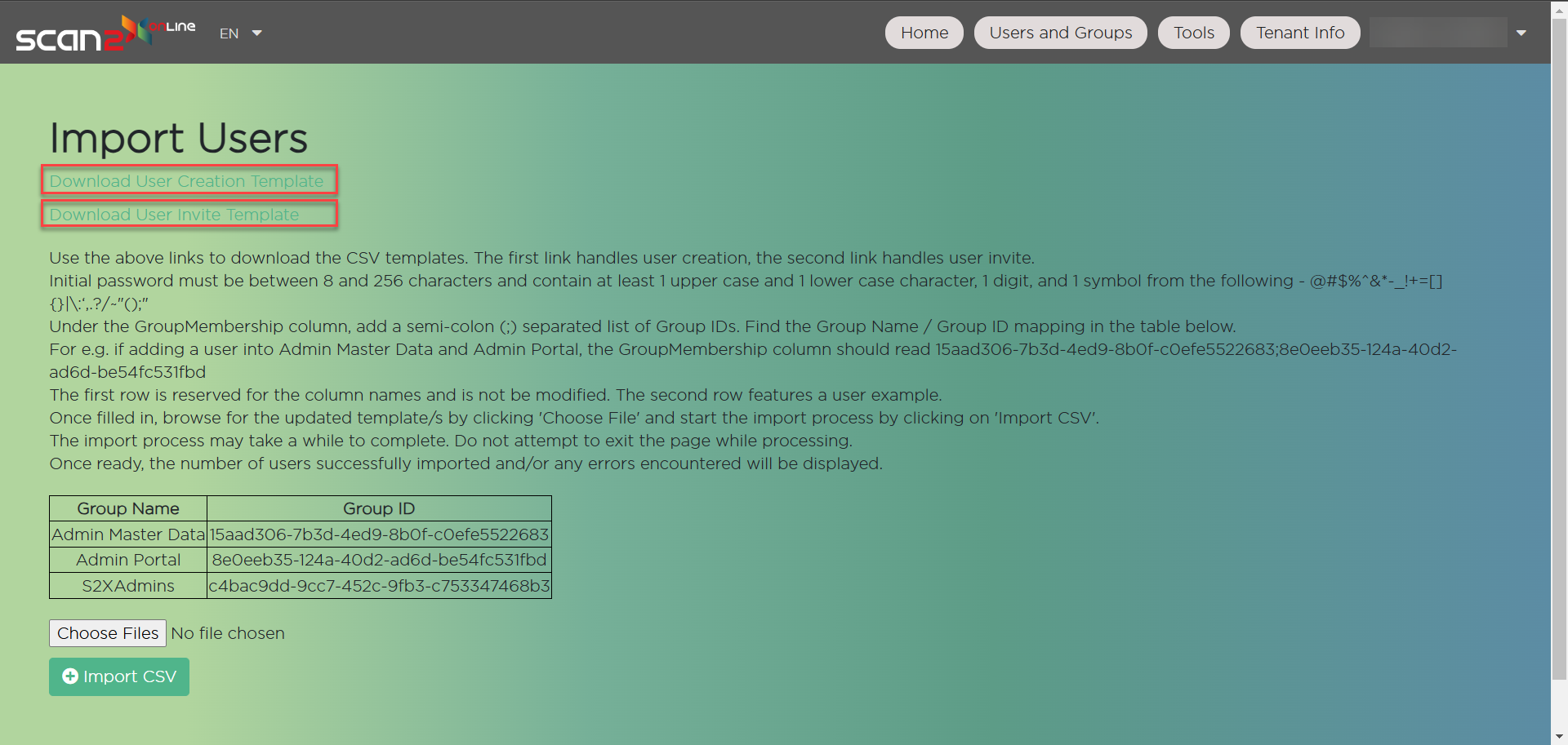 Once the User Creation or User Invite template has been filled in, the administrator must then upload the template from the Choose Files option and click Import CSV.