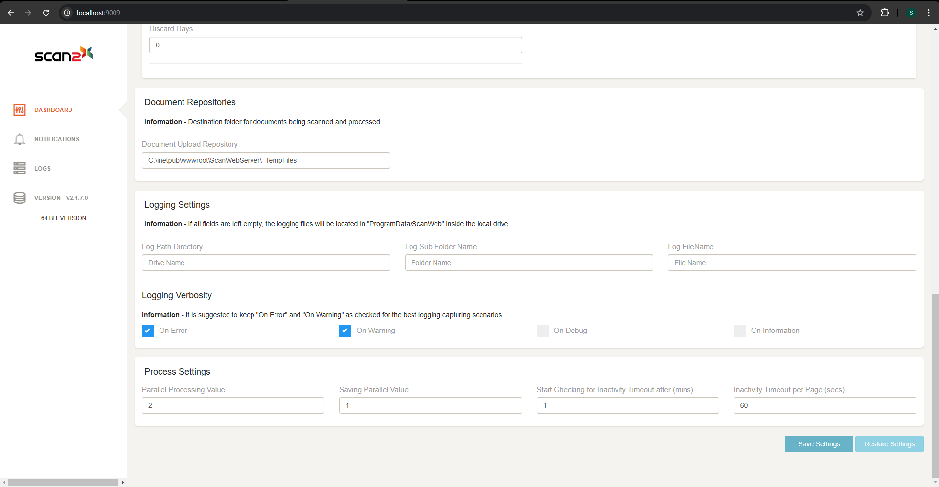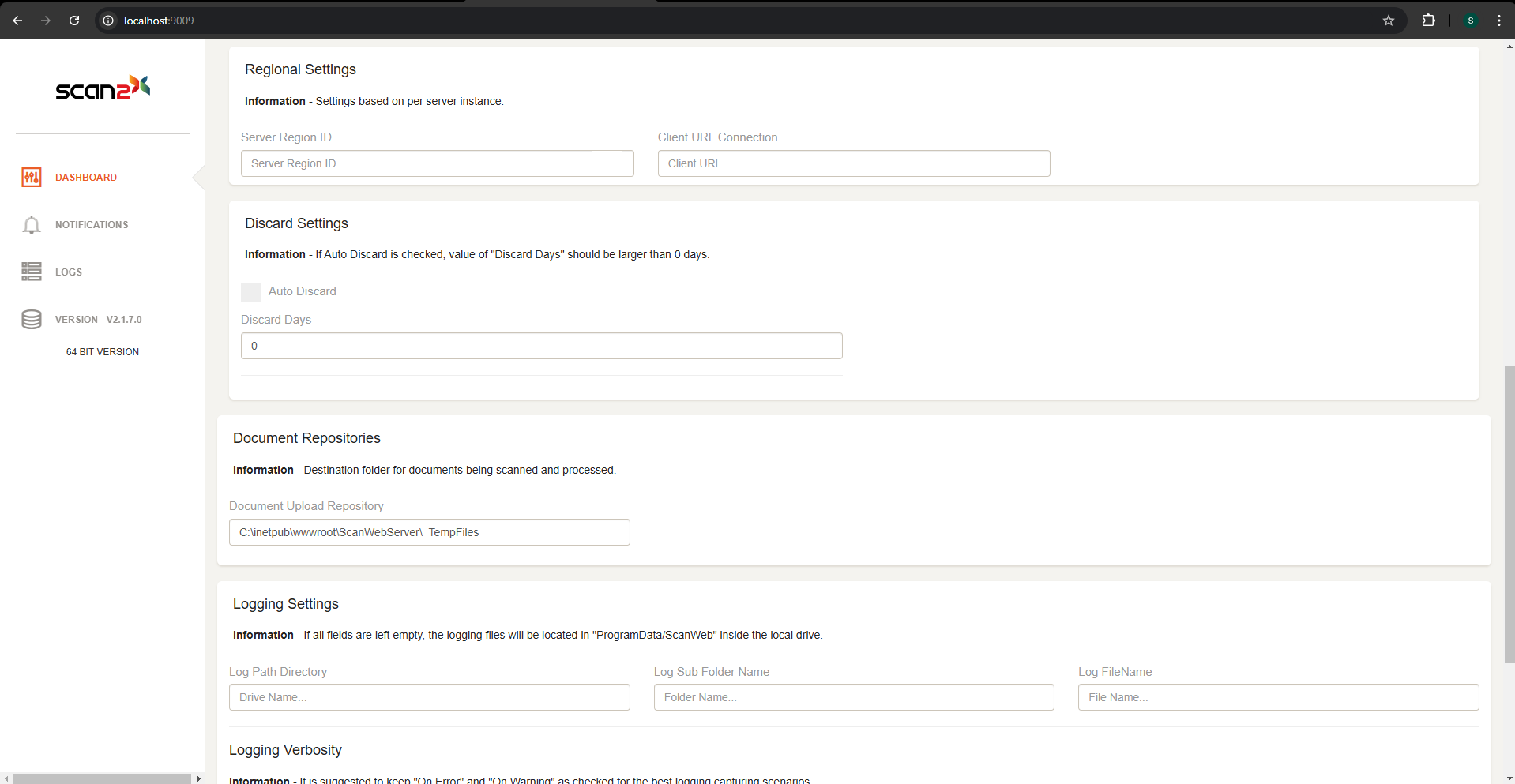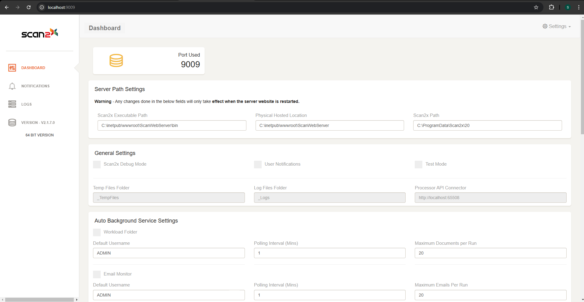 The Scan2x Server Dashboard allows the administrator to configure technical settings for Scan2x to work accordingly.