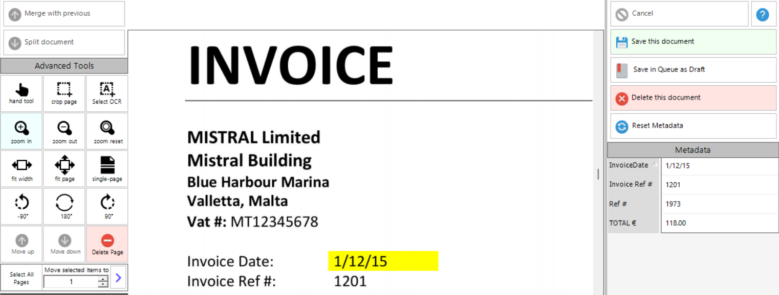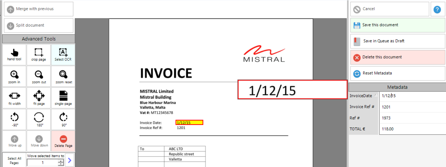 •Select OCR - allows the user to select OCR to either fill in or override information in a metadata field.