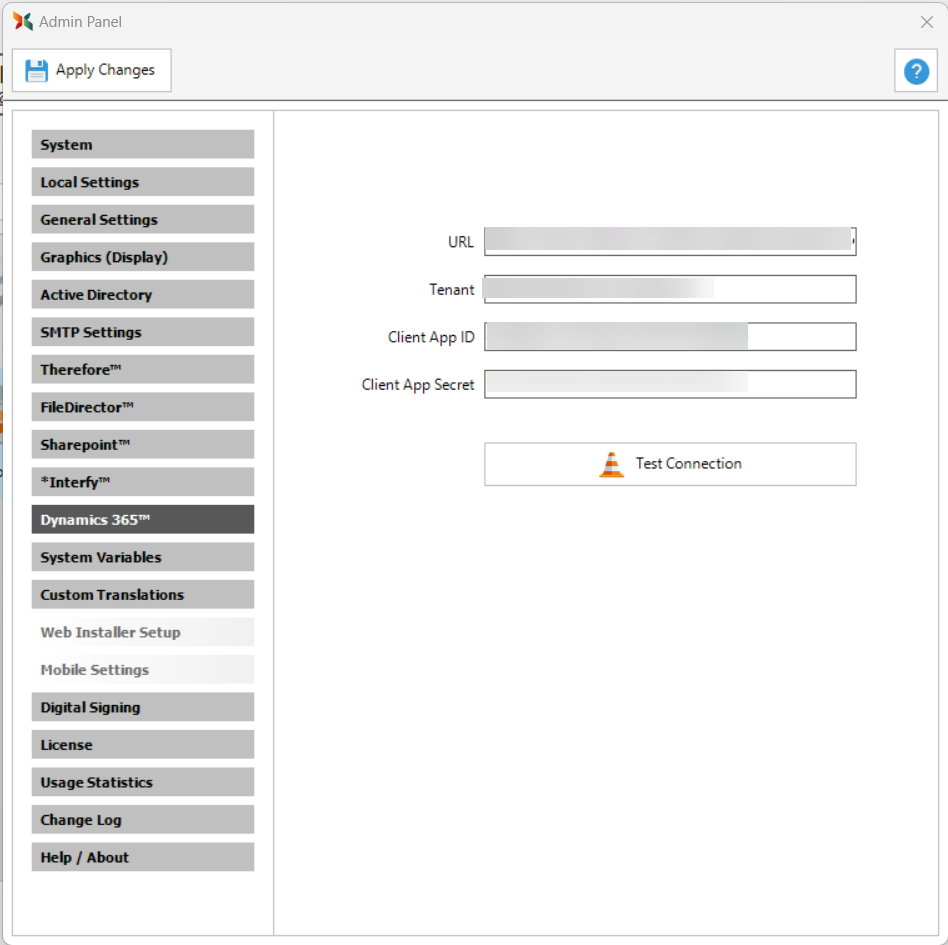 •Test Connection - Once the above credentials have been input, the administrator can click Test Connection to make sure Scan2x has connected to the Dynamics 365™ site accordingly.