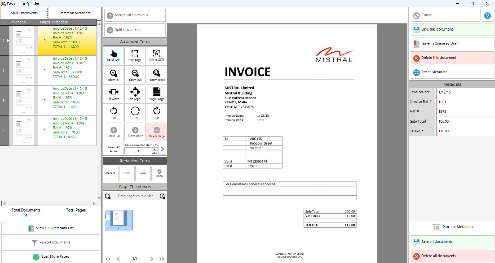 When scanning jobs in which Document Splitting is enabled, the document display shows a list of documents in the batch on the far left together with the metadata for each of the documents.