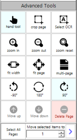 Checkboxes are provided next to each thumbnail in the scan preview screen, enabling the selection of multiple pages for applying the Advanced Tools functions mentioned earlier. For instance, if pages 1, 3, and 5 need to be rotated, you can simply select those pages and click the Rotate button once. By using the Select All Pages option, users can select the entire batch of pages and either move them to a specific location or rotate them just as they would with a single page.