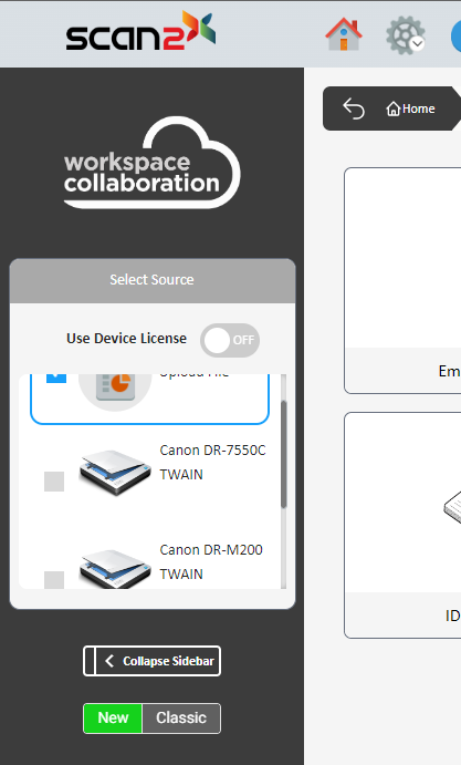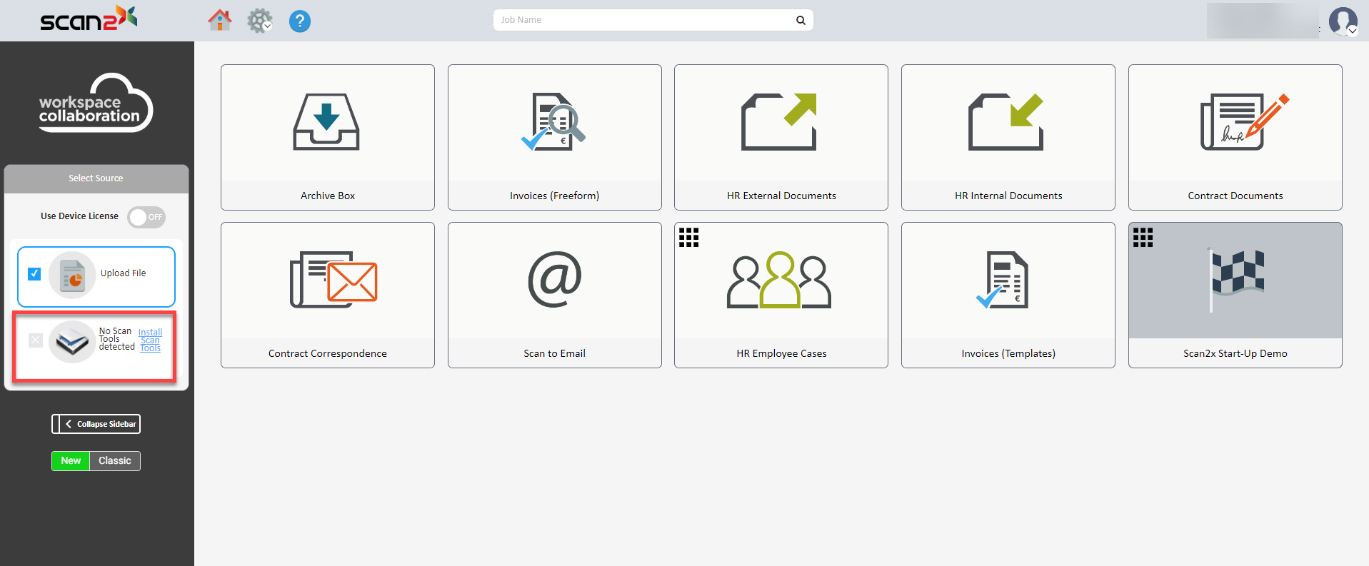 If the user would like to scan documents to the job with a scanner, they would need to click Install Scan Tools. Once clicked, the Scan Tools will begin to download and once the Scan Tools have been installed, the user will need to refresh the page and on the left-hand side of the screen in the Select Source section, all of the available scanner drivers found on the device will show.