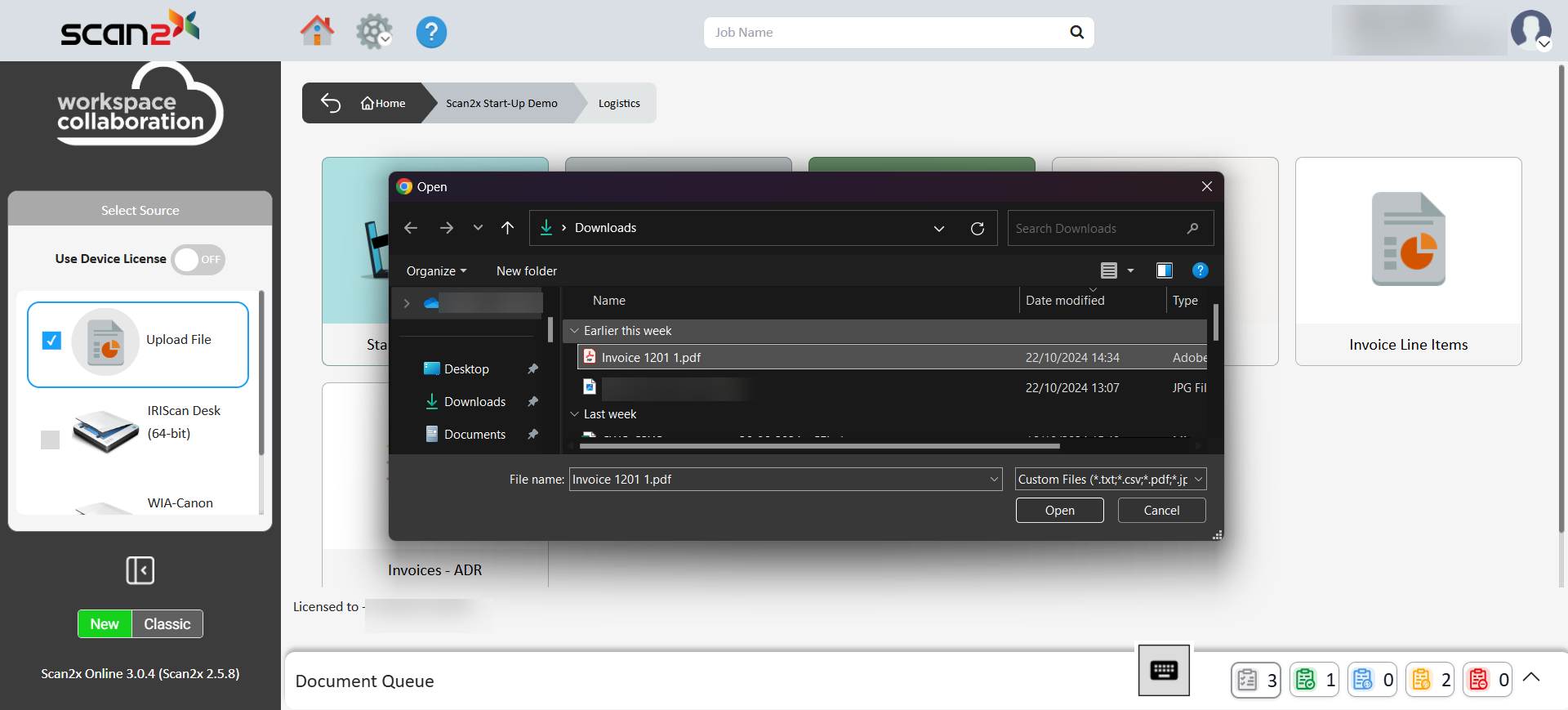 For example, if uploading documents to the Invoices job, the system will prompt the user with their file explorer tab in order for them to select the documents to be scanned.