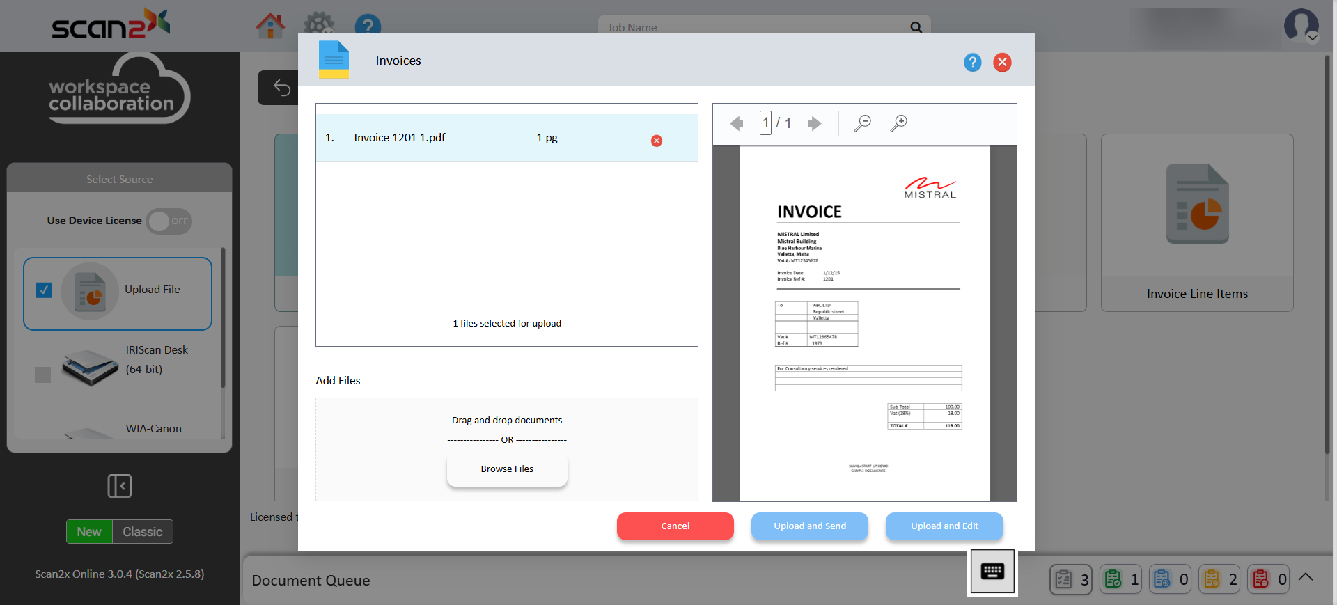 •Upload and Edit - When clicked, the document will be uploaded and the Scan Preview will open showing the document processing to the user.