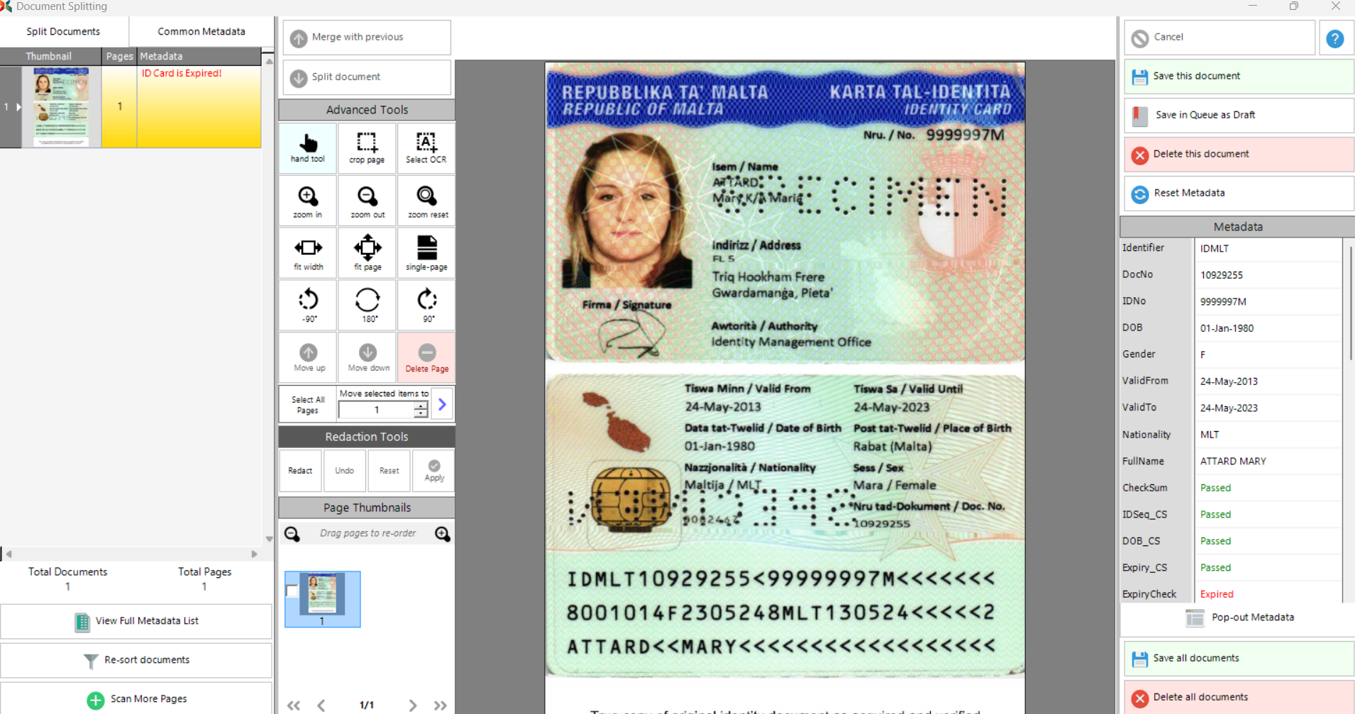 National Identity Card documents that conform to ICAO Standard 9303 are used by 188 countries and territories around the globe. The documents are presented in the form of a credit-card sized plastic card with a Machine-Readable Zone (MRZ) on the back. This MRZ is formatted in such a way as to facilitate the Optical Character Recognition (OCR) of the information within it with 100% certainty, due to the security algorithms built into the data. By OCRing the MRZ and passing the data through these security algorithms, we can achieve the following: