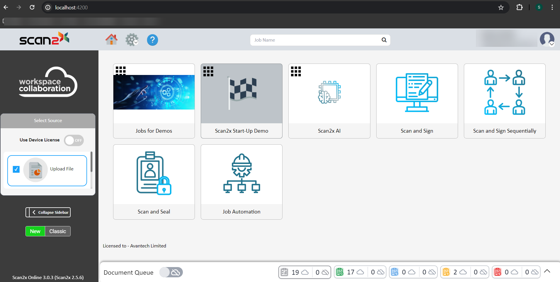 On the new Scan2x Online interface when using a Scan2x Hybrid environment, users are able to upload documents to an offline queue and manually sync them to the online queue, or upload documents directly to the online queue.